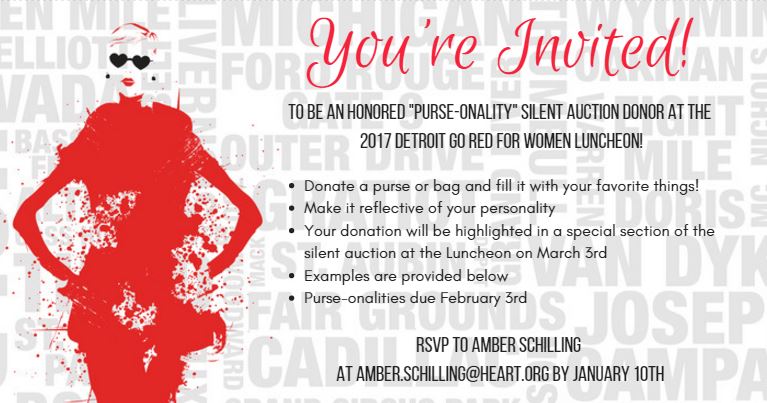 Please RSVP by January 10th to Amber Schilling at amber.schilling@heart.org. Purse-onalities will not be due until February 3rd. Feel free to reach out with questions or for more information!